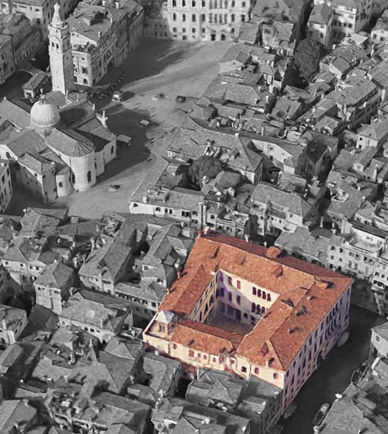 A Grimani-palota Velence szívében áll, csak egy hídra a város egyik legelevenebb társadalmi központjától, a Santa Maria Formosa terétől, ahol a maga korában a leghíresebb cortegiana, Veronica Franco szalonja, és a lepantói győztes Sebastian Venier palotája állt. A palota előtt vezetett el a Ruga Giuffa, amely, mint neve mutatja, az új-julfai örmény kereskedők gazdag és forgalmas főutcája volt. Ugyanakkor az épület teljes magányba burkolózott. Két oldalról egy-egy csatorna, a Rio de Santa Maria Formosa és a Rio San Severo, a harmadikról egy szomszédos ház szigetelte el a külvilágtól, s negyedik oldalról, az örmény utcáról csak egy szűk benyíló vezetett be hozzá. Grimani a világ egyik legintenzívebb városának forgatagából megtérve azonnal elmerülhetett dolgozószobája magányában.