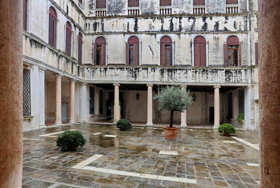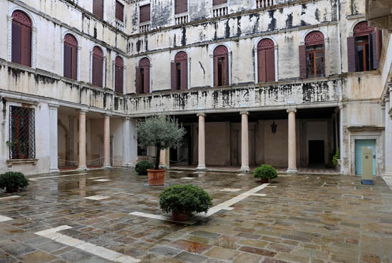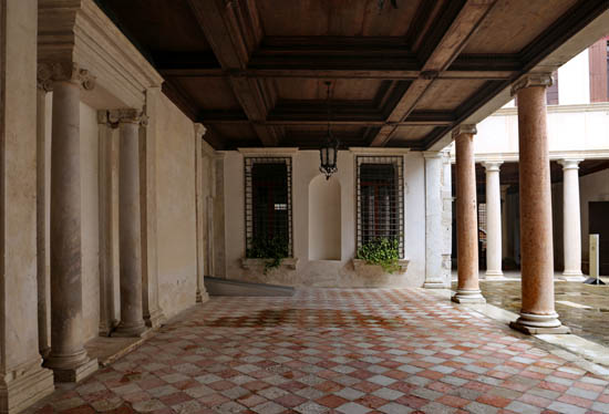 Amikor testvérével, Vettoréval együtt a telket 1530-ban megörökölték nagybátyjuktól, Antonio Grimani dózsétól, már eleve úgy döntöttek, hogy valami újat, Velencében sosem látottat építenek ott. A vörös márvány oszlopokkal körülvett négyszögű udvar nem a velencei kereskedőházak, hanem az antik római domusok udvarait imitálja, úgy, ahogy a nagy reneszánsz építészetteoretikusok azt követendő mintának állították.