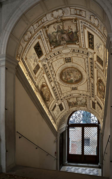 Az első emeletre felvezető lépcsőházat Grimani pátriárka Vettore halála után egyedül díszíttette 1563 és 1565 között a Rómában már nevet szerzett manierista Federico Zuccarival. Zuccari csak miatta jött el Rómából, s a palota lépcsőházán kívül a pátriárka saját kápolnájában, a San Francesco della Vignában is festett freskókat és oltárképet. Amellett pályázott a San Rocco és a Doge-palota freskóira is, de sikertelenül, úgyhogy ezután Firenzében, Rómában és Párizsban folytatta karrierjét. Itt, a lépcsőház mennyezetén a megbízó erényeit ábrázoló freskók mellett a gazdag stukkó-körítés Grimani ókori gemma-gyűjteményének motívumait ismétli, amivel már előre is szaladtunk egy kicsit.