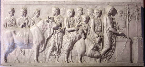 Suovetaurilia, a közösség jólétéért és termékenységéért bemutatott sertés-birka-bika-áldozat. Az 1637-ben Montalto di Castro mellett feltárt, s Napóleon által 1801-ben a Louvre-ba elhurcolt római dombormű 17. századi másolata