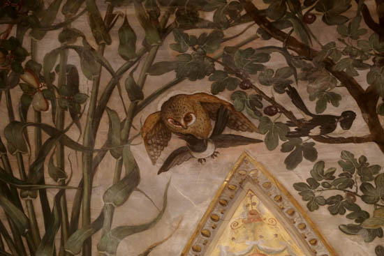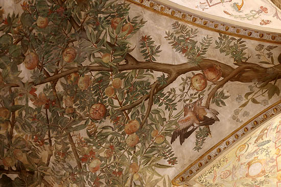 A másik érdekes terem a Sala a Fogliami, a Lombok terme, amely mennyezeti lombdíszéről kapta a nevét. A freskót alkotó sokféle fa, gyümölcs és virág, s a közöttük megbúvó, repkedő és zsákmányoló madarak természettudományos hűséggel ábrázolt sokasága már átvezet a reneszánsz csodakamrák egy következő fejezetéhez, az emberkéz alkotta művektől az Isten alkotta csodákhoz.