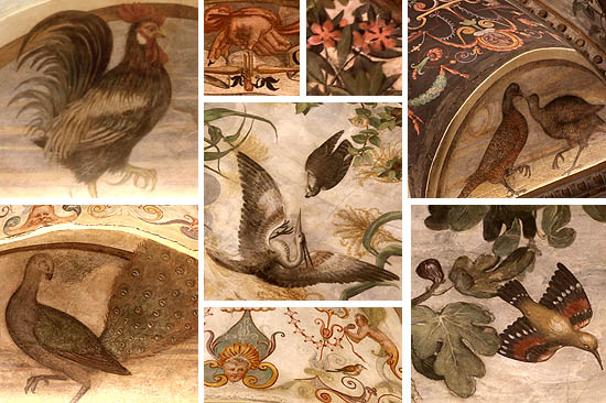 A másik érdekes terem a Sala a Fogliami, a Lombok terme, amely mennyezeti lombdíszéről kapta a nevét. A freskót alkotó sokféle fa, gyümölcs és virág, s a közöttük megbúvó, repkedő és zsákmányoló madarak természettudományos hűséggel ábrázolt sokasága már átvezet a reneszánsz csodakamrák egy következő fejezetéhez, az emberkéz alkotta művektől az Isten alkotta csodákhoz.