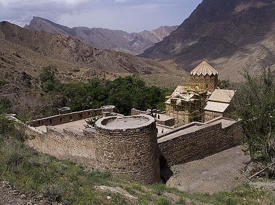 A Szent Tádé-kolostort a hagyomány szerint maga Szent Júdás Tádé apostol, „az Úr testvére” és az örmények első térítője építette 66-ban, s az 5. századi Movses Khorenatsi, az első örmény krónikás szerint itt is van eltemetve. Ha ez így van, akkor a templom egyenrangú Péter és Pál apostolok római bazilikáival, Jakab apostol compostelai sírjával vagy Tamás apostol madrasi székesegyházával, csak éppen sokkal ismeretlenebb azoknál. Egy földrengés után 1324-ben építették újjá mai formájában, s fekete-fehér kövei miatt a helyiek félig azeri török, félig a Kirché-vel rokon perzsa kifejezéssel Qara Kelisá-nak, fekete templomnak nevezik. Az armenica.org-on részletes leírást, sok jó képet és rajzot találunk róla.