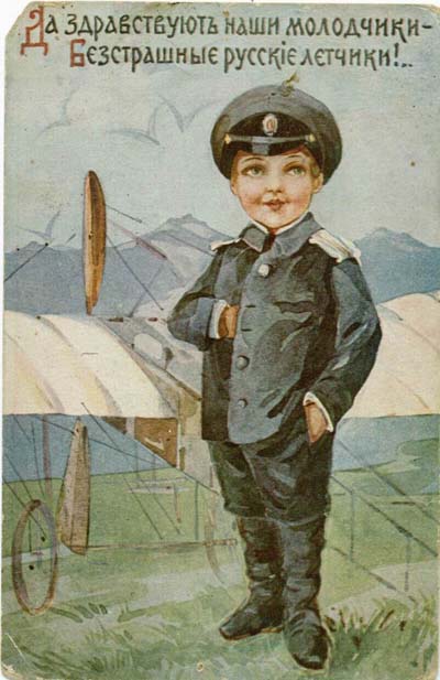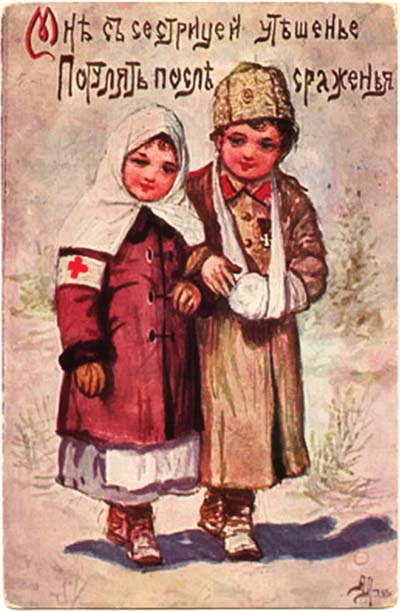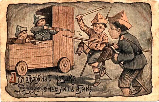 Florence Notter: Soldier Bob guarding Mother’s Land, az egyik legnépszerűbb első világháborús brit hazafias gyerekkönyv, 1915 k.Az első világháborúban több hadviselő fél is jelentetett meg olyan rajzokat, amelyek korabeli katonának öltözött gyerekeket ábrázolnak. Ezeknek a képeknek a referenciája szándékosan ingadozik: nem határozható meg pontosan, vajon bájos kisgyerekként ábrázolt igazi katonákról van-e szó, vagy a korabeli harci cselekményeket imitáló gyerekekről, akik egyszersmind így készülnek fel a nekik szánt szerepre. Az alábbiakban egy orosz képeslap-sorozatot látunk a világháború elejéről.