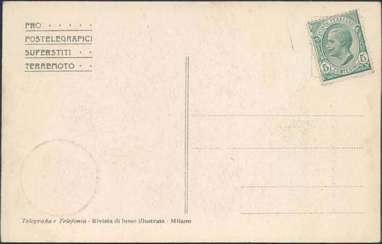 Az újjáépítés megsegítésére kiadott képeslap a messinai túlélő postások képével, segélybélyegek orosz, német és magyar címlettel, és a mentésben részt vevő orosz, angol és