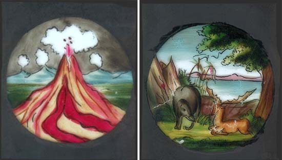 A képeken ilyenformán felismerhető a földtörténet ókora a karbon pecsétfákkal, és a szárazulatot meghódító állatokkal. Az ezt követő gatyás, kifeszített szárnyú élőlény akár az Archeopteryx is lehetne. A bombákat, hamut és lávát öklendező vulkánnal beköszöntő harmadidőszaki katasztrófa után eljön az emlősök ideje. A fán gubbasztó majomféle pedig már az emberszabásúak megjelenését jelzi.