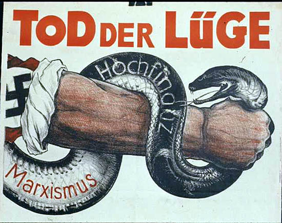 Szergej Igumnov: Irtsuk ki a kémeket és diverzánsokat, a fasizmus trockista-buharinista ügynökeit, 1937.(A zavaros képaláírás a hivatalos ideológia zavarodottságát tükrözi. A kígyó ugyan náci monoklit