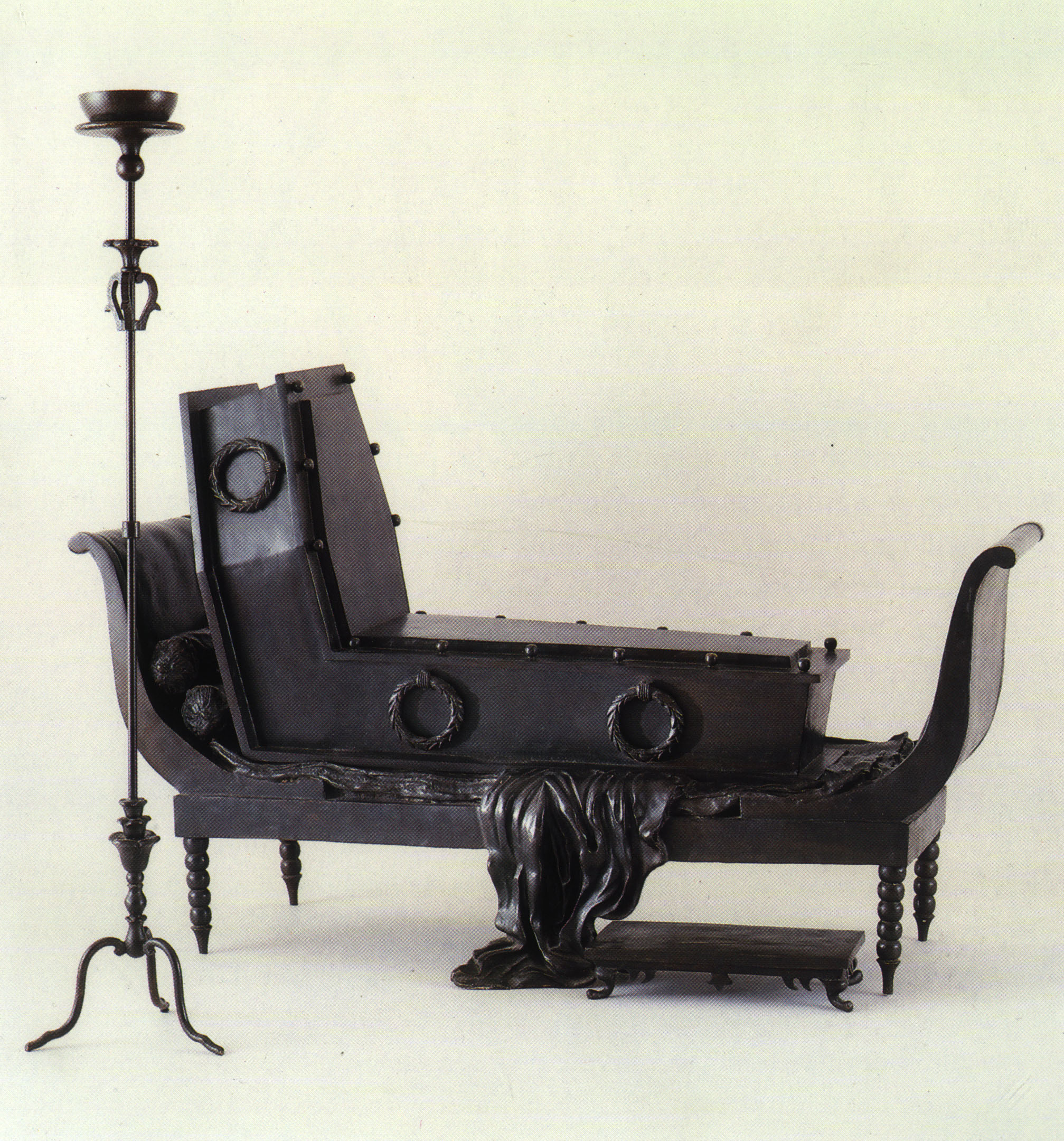 René Magritte: David Madame Recamier-je, 1967. Lámpaoszlop, rekamié és koporsó: 114×188×67 cm. Houston (Texas), a The Menil Collection szívességéből