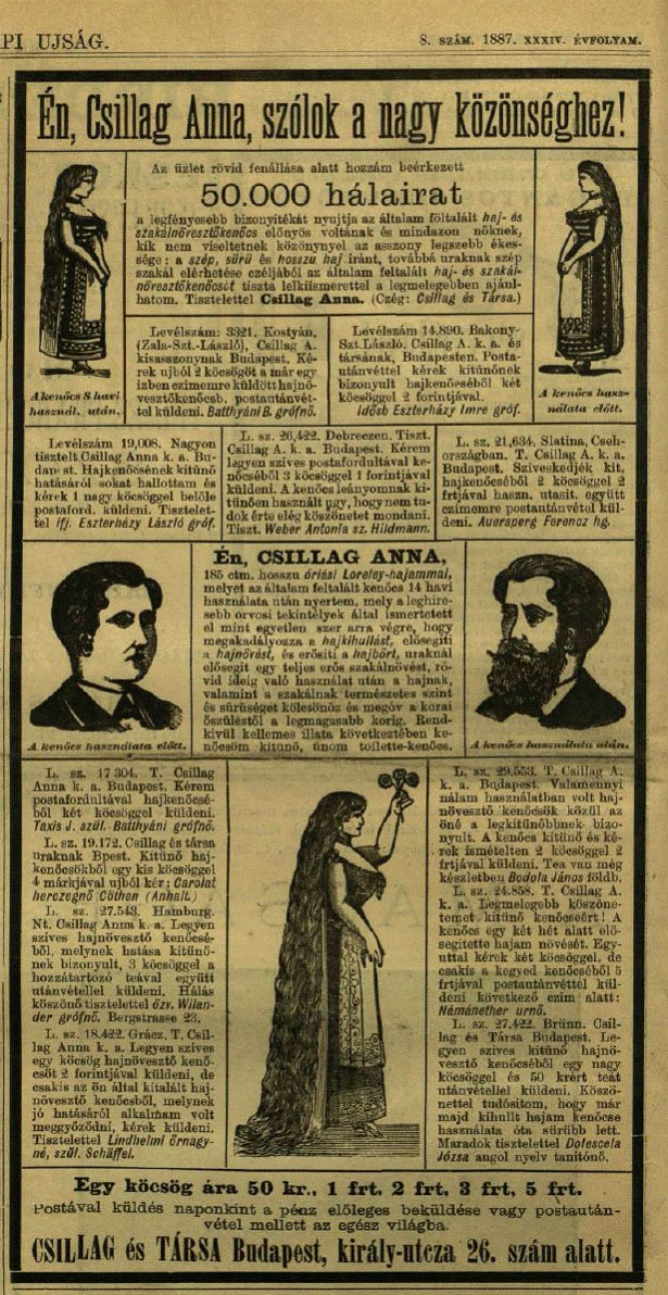 „A nagy fóliánslapon egy nőalak volt látható; zömök, izmos testalkatú, s energikus arcvonásai nagy élettapasztalatra vallottak. E hölgy fejéről hatalmas hajbunda omlott alá, súlyosan gördült le a hátán, s vastag fonadékainak vége a földet söpörte. Ez a hajgyökerekből szövődő, hullámos, dús köpeny a természet valószínűtlen kilengésének látszott, s bajos volt elképzelni, hogy ekkora súly ne okozzon erős fájdalmat, ne bénítsa meg a megterhelt fejet. Tulajdonosa azonban szemmel láthatólag büszkén viselte e pompázatosságot, a melléje nyomtatott vastagbetűs szöveg pedig a csoda történetét hirdette, e szavakkal kezdvén: „Én, Csillag Anna, ki a morvaországi Karlovicében születtem, a gyatra hajnövés csapása alatt görnyedeztem…” Hosszú történet volt ez, szerkezetében Jób történetéhez hasonlatos. Csillag Annát gyatra hajnövéssel verte meg az Isten. Az egész városka szánakozott e szörnyű csapáson, melyet feddhetetlen életére való tekintettel megbocsátottak neki, de mégsem mentették fel egészen. S íme, történék, hogy imádsága meghallgatást talált, s levétetett fejéről az átok: a megvilágosodás kegyelme áradt Csillag Annára, jeleket és útmutatást kapott, s egy csodaszert, nagyszerű orvosságot készített, mely meghozta fejének termékenységét. Fejét sűrűn belepte a haj, s ez még nem volt elég: férje, fivérei és unokafivérei is egyik napról a másikra sűrű fekete szőrbundát eresztettek. A másik oldalon látható volt Csillag Anna, hat héttel receptjének kinyilatkoztatása után, öccsei és bátyjai, sógorai és unokafivérei, e derékig érő szakállal és bajusszal büszkélkedő férfiak körében; csodálattal bámulhatta az ember e hamisítatlan medvei férfiúság valóságos kitörését. Csillag Anna boldoggá tette az egész városkát, melyre valóságos áldás áradt, hullámzó bozontok és óriás üstökök képében, s melynek lakói a földet söpörték széles seprűhöz hasonlatos hosszú szakállukkal. Csillag Anna az emberi szőrzet apostola lett. Miután szülővárosát már boldogította, arra sóvárgott, hogy boldoggá tehesse az egész világot, s kért, buzdított, könyörgött, hogy saját üdvösségünk érdekében fogadjuk el ezt az isteni ajándékot, e csodaszert, melynek titkát egyedül ő ismeri.”
