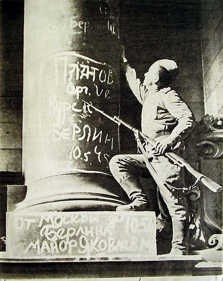 Szergej Ivanovics Platov tüzér felírja a nevét a Reichstag oszlopára. Anatolij Morozovnak, a Фронтовая иллюстрация (Képek a frontról) tudósítójának felvétele, 1945 május 10, innen
