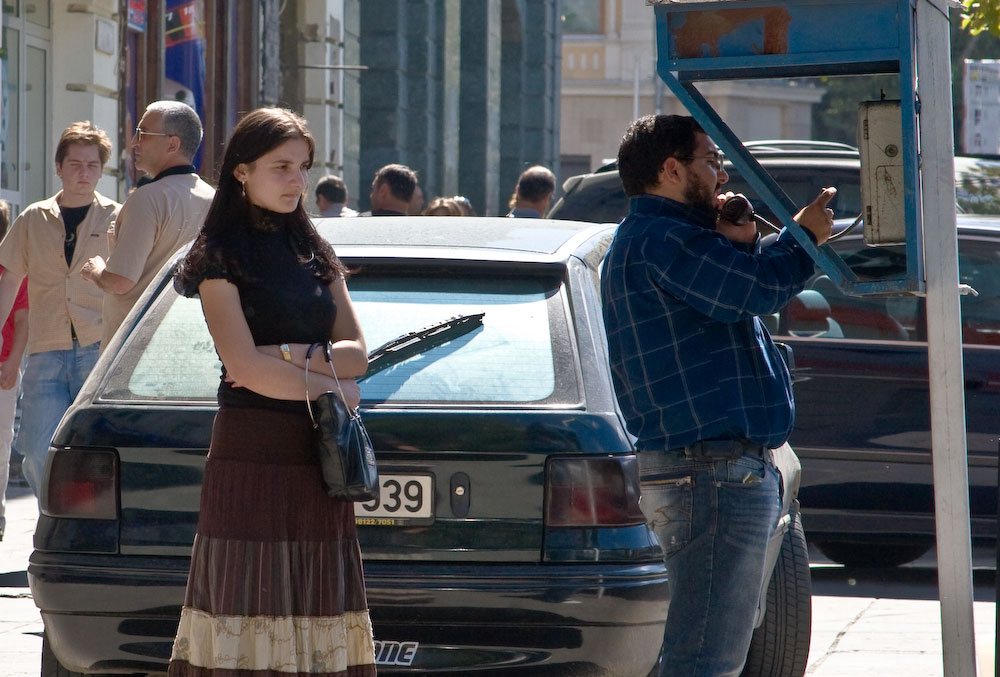 „Sorbanállás az utcai telefonnál. Ezeket még a szovjet időkben szerelték fel, és máig rendszeresen használják őket.” A mobiltelefon még nincs elterjedve Grúziában, de a hagyományos hálózat jól kiépült, és ezek a húsz-harmincéves utcai fülkék bámulatosan jól működnek.