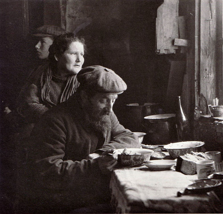 „Byale (Biała Podlaska, Lublin megye), 1926. Apa és fia. A rontástól tartva Leyzer Bawół, a kovács nem mondja meg a korát, de százon felül járhat. Ma már fia végzi a kovácsmunkát, s az öreg orvoslással foglalkozik. Törött karokat-lábakat tesz helyre.”