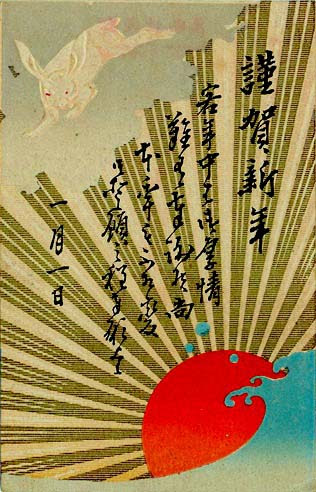 Japánban régi szokás újévre képeslapokat – 年賀状 nengajō – küldeni a családtagoknak és barátoknak a beköszöntő évet jelképező állat rajzával. A kínai/ázsiai állatévek tizenkét évenként ismétlődnek, így a 20. század első felének nyúl-évei 1903-ra, 1915-re, 1927-re, 1939-re és 1951-re estek. Ezekből az évekből származnak az alábbi képeslapok.
