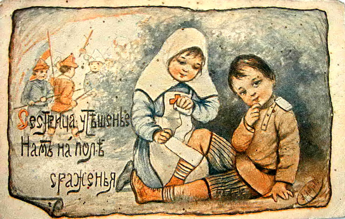 Florence Notter: Soldier Bob guarding Mother’s Land, az egyik legnépszerűbb első világháborús brit hazafias gyerekkönyv, 1915 k.Az első világháborúban több hadviselő fél is jelentetett meg olyan rajzokat, amelyek korabeli katonának öltözött gyerekeket ábrázolnak. Ezeknek a képeknek a referenciája szándékosan ingadozik: nem határozható meg pontosan, vajon bájos kisgyerekként ábrázolt igazi katonákról van-e szó, vagy a korabeli harci cselekményeket imitáló gyerekekről, akik egyszersmind így készülnek fel a nekik szánt szerepre. Az alábbiakban egy orosz képeslap-sorozatot látunk a világháború elejéről.