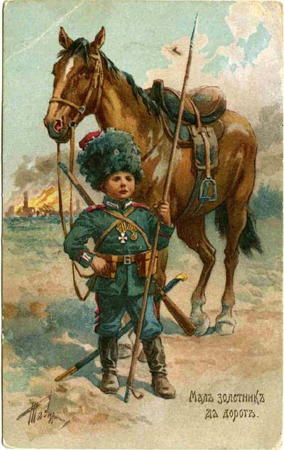 Az első világháborúban több hadviselő fél is jelentetett meg olyan rajzokat, amelyek korabeli katonának öltözött gyerekeket ábrázolnak. Ezeknek a képeknek a referenciája szándékosan ingadozik: nem határozható meg pontosan, vajon bájos kisgyerekként ábrázolt igazi katonákról van-e szó, vagy a korabeli harci cselekményeket imitáló gyerekekről, akik egyszersmind így készülnek fel a nekik szánt szerepre. Az alábbiakban egy orosz képeslap-sorozatot látunk a világháború elejéről.