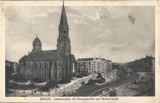 Az Emmauskirche egy 1925-ben Ausztriába küldött képeslapon, előtérben a Hoch- (ma U-)Bahnnal, jobbra épp lemaradt a Görlitzi pályaudvar