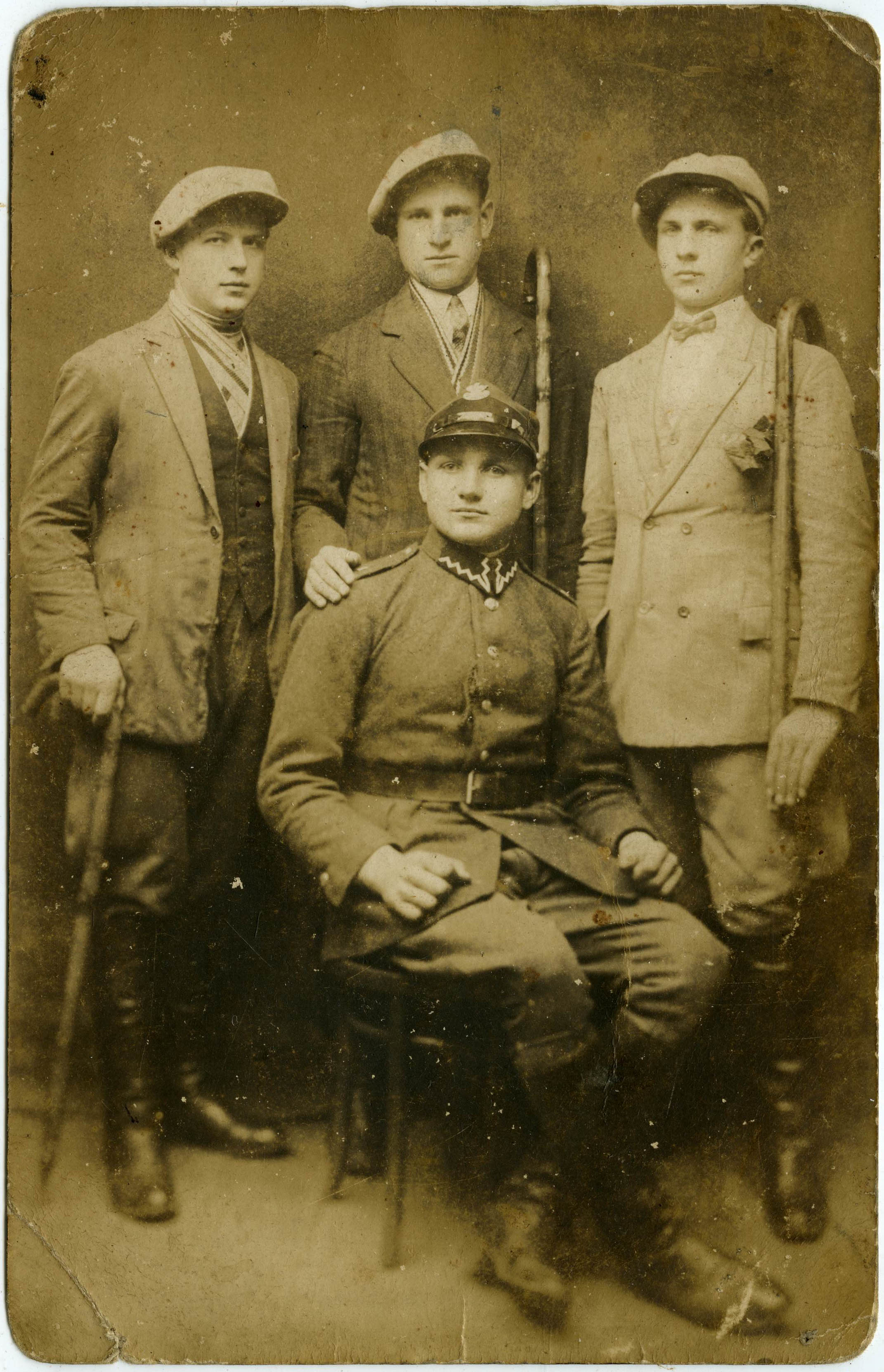 A fénykép ünnepelt főszereplője immár az újonnan megalakult független lengyel hadsereg egyenruháját viseli, amely 1929-ig maradt ebben a formában. Három álló társa marcona tartással kompenzálja az egyenruha hiányát és demonstrálja, hogy ha a haza szólít, ők is helytállnak majd. Szükség is lesz rá nemsokára.