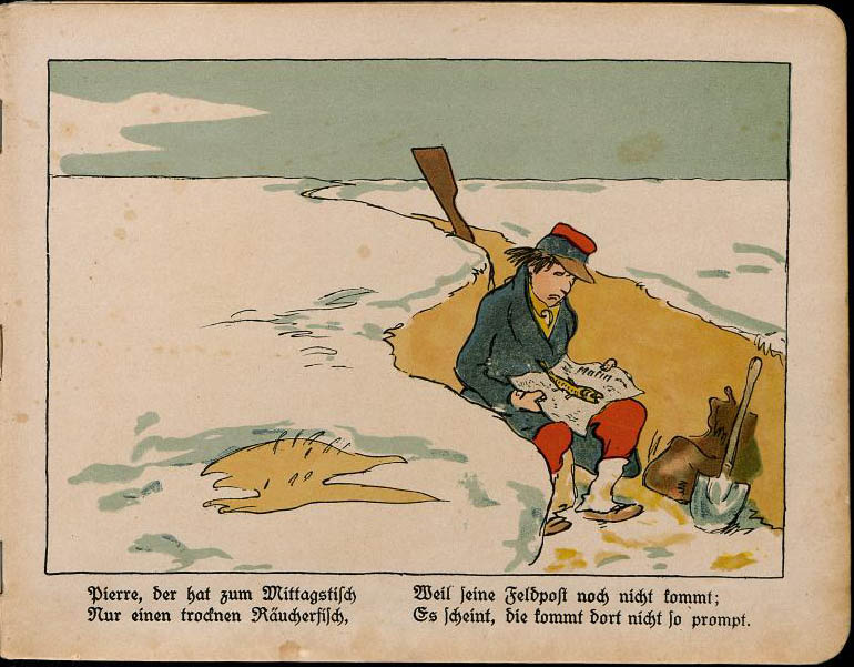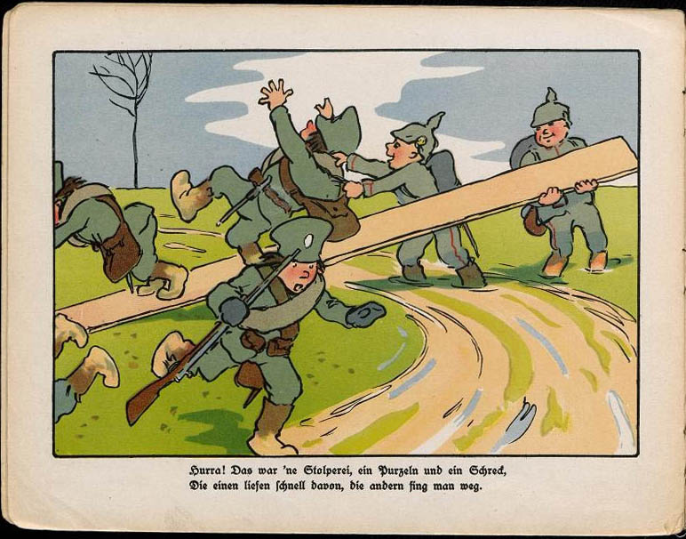 Meglepő, milyen fontosnak tartotta a Scholz kiadó naprakészen tudósítani a gyermekeket a háború fordulatairól. Az 1915-ben megjelent Die Geschichte vom General Hindenburg (Hindenburg tábornok története) azt szemlélteti közérthető módon, miként állta útját a nyugállományból visszatérő Paul von Hindenburg tábornok a Poroszországra törő orosz seregnek, hogyan ejtette csapdába őket kétszer is egymás után a mazuri mocsarakban, majd a téli hadjáratot követően hogyan verte ki őket osztrák és magyar barátaival együtt Galíciából és Orosz-Lengyelországból is. A trükk pofonegyszerű: végy két kölyökkatonát, várd meg, míg az orosz gyerekek felmasíroznak a mazuri mocsarak közé fektetett pallóra, s akkor a német kölykök fordítsák fel a pallót. Télen kitűnő muníció a hógolyó is, amelyhez az oroszok egyáltalán nincsenek hozzászokva. Móka, kacagás, diadalmenet.