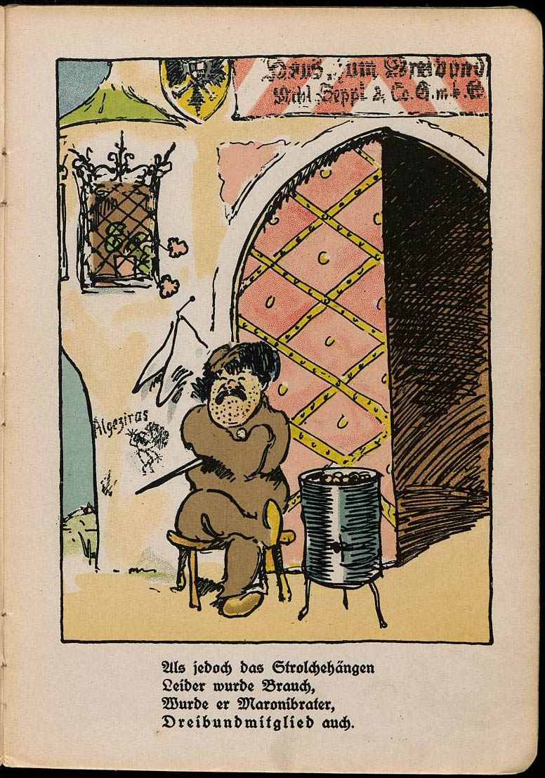 A német háborús gyerekkönyv-piacból mindjárt kezdettől fogva jelentős szeletet hasított ki magának a mainzi Joseph Scholz kiadó, akinek könyveit az akkor már népszerű Arpad Schmidhammer (1857-1921) illusztrálta. Jellegzetesen magyar neve ellenére Arpad Emil Schmidhammer német családban született a cseh Érchegységben, St. Joachimsthalban, a Joachimsthaler, azaz a tallér szülővárosában (ma Jáchymov). Rajzolni Grácban és Bécsben tanult. Alapításától fogva illusztrátora volt a Jugendstilnek nevet adó müncheni Jugend folyóiratnak (1896-1940), politikai karikatúrákat készített sok más lapnak, és számos mesekönyvet illusztrált. Nem sokkal a világháború kitörése előtt a Jugend 1914/26. számában a balkáni háborúról publikált rajza még meglehetősen pacifistának mutatja: