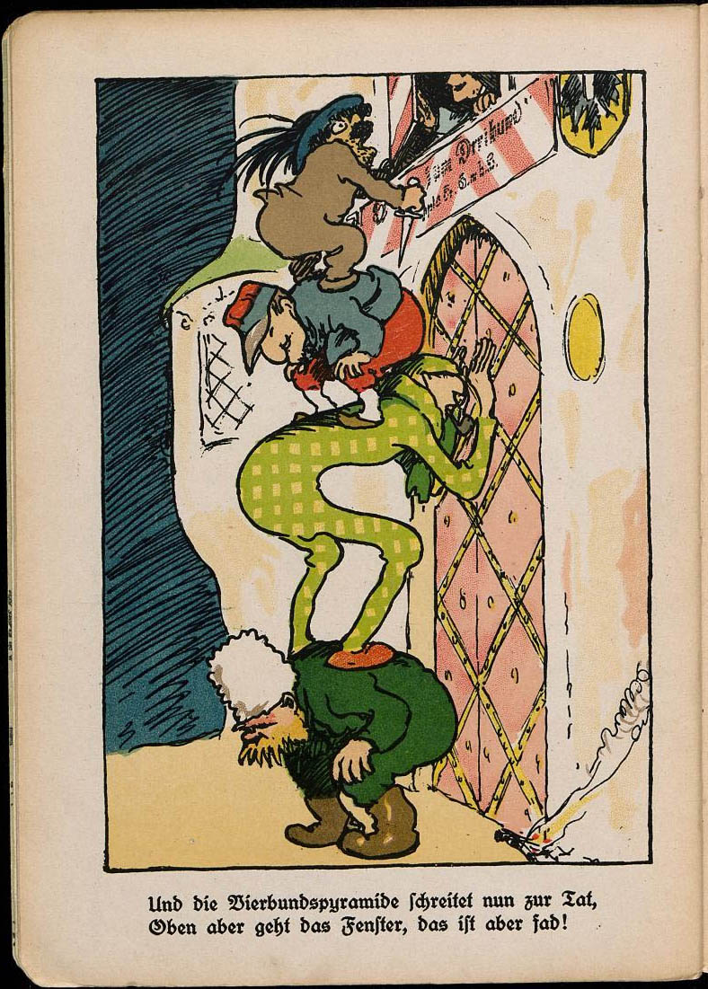 A háború kitörésével egy időben jelenhetett meg a sorozat első darabja, a Lieb Vaterland, magst ruhig sein! Ein Kriegsbilderbuch mit Knittelversen, azaz Édes hazánk, légy nyugodt! Háborús képeskönyv párversekkel. A könyv célja, hogy világos és egyszerű metaforával magyarázza el a háború kitörésének okát és várható kimenetelét. A német Michl és az osztrák Seppl közösen művelgetik kertecskéjüket – hol van már Königgrätz! – ám a rosszcsont szerb Lauszevics, azaz Tetűfi, orosz bátyja, Nikolaus támogatásában bízva egyre csak piszkálja Sepplt a kerítésen át. Miközben a feldühödött Seppl a két csirkefogó baját látja el, Michlnek a kert túloldalán a nyelvét öltögető Jacques-kal és brit öccsével gyűlik meg a baja. S ha ez még nem lenne elég, hát lábal már át a vízen az amerikai John is japán majmával, hogy kiszaggassák a kert virágait. Michl és Seppl azonban mindenkinek megadja, ami neki dukál. Az összes csirkefogót ketrecbe zárják, s a kert körül szép új kerítést emelnek. Mondjuk ez az utóbbi metafora meg is felel a történeti valóságnak, azzal a különbséggel, hogy a szép új kerítést végül a csirkefogók emelték a kert körül.