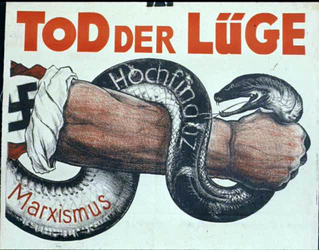 Szergej Igumnov: Irtsuk ki a kémeket és diverzánsokat, a fasizmus trockista-buharinista ügynökeit, 1937.(A zavaros képaláírás a hivatalos ideológia zavarodottságát tükrözi. A kígyó ugyan náci monoklit