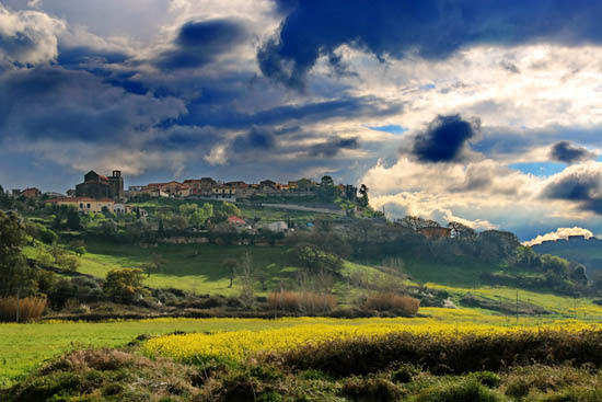 Ardara (Szardínia) templomerődje és városa vihar után, alkonyatkor