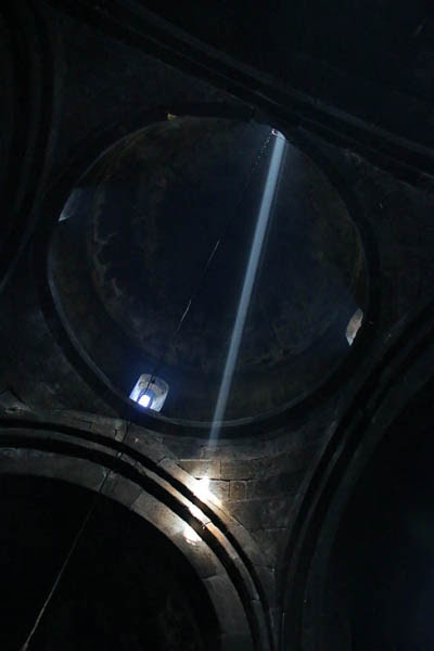 A vasárnapi mise nemrég érhetett véget, a pap a templomkertben asszonyokkal uzsonnázik. A kupola ablakán beeső fénysugár késpengeként tör át a templombelső sötétjén, éppen mint egy éve a lembergi örmény templomban. Elmesélem a többieknek, hogyan lépett oda hozzánk akkor a templomi kórus vezetője, és hogyan énekelte el nekünk húsvéti himnuszukat. Ekkor lép be a templomba a pap. Honnan jöttünk, hogyan tetszik Örményország. Majd a templom akusztikájának illusztrálására az oltár előtti felolvasóállványhoz lép, amelyen a 17. században Velencében, Misztótfalusi Kis Miklós örmény betűivel nyomott misekönyv fekszik tán azóta, s a lenyűgözötten hallgató társaság előtt elénekli belőle a húsvét utáni vasárnap himnuszát.