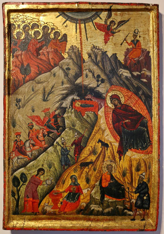 A legnagyobb epiruszi ikonfestő mester, Onufri fia, Nikola által írott 16. századi ikon hűen követi az orthodox ikonográfia szabályait, s minden mozzanata egy-egy teológiai utalást hordoz. A sziklás táj közepén barlangban, pólyába csavarva fekszik a megszületett Jézus – ahogy barlangban, lepelbe csavarva fekszik majd kereszthalála után is –, akit az ökör és a szamár azonnal felismer, mint Urát. A jászol fölött az égen csillag tűnik fel, sugara Jákobnak a földön feltűnt csillagára mutat. Errefelé igyekszik a három király, a pogányság, és az angyalok által hívott pásztorok, a zsidóság képviselői. A dicsfényben fekvő Mária a kép bal alsó sarkába tekint, ahol kötelezően egy fácska sarjad, utalva Jessze fájára, Jézus leszármazására: „Vessző kél majd Jessze törzsökéből, hajtás sarjad gyökeréből.” (Iz 11,1) A legalsó régióban pedig két apokrif evangéliumból származó jelenet, mindkettő a kételkedésen felülemelkedő hit példája: Salome, a Jézus születésénél segédkező bábaasszony, aki személyesen győződött meg Mária szüzességéről, és József, akit az öregember képében érkező Sátán kísért meg azzal: ha Jézus fogantatása isteni volt, miért földi módon jön a világra?