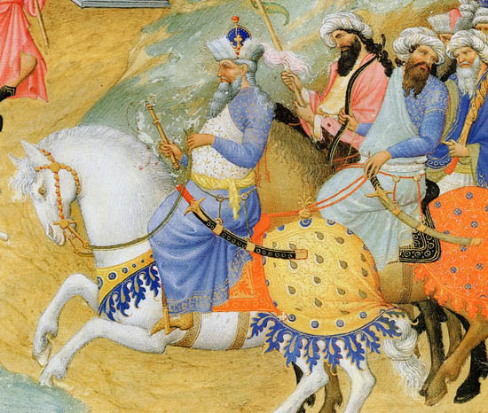 A baloldali képen azonban valami szokatlan epizódot látunk. A három király és kíséretük három égtáj felől közeledik a középen álló gótikus képoszlop – azaz kis fülkékben szentek szobrait vagy képeit a vándorok elé táró, útjukat megszentelő magányos útszéli oszlop – felé, amilyenek a Párizsból St. Denisbe vezető utat szegélyezték. Körülöttük pusztaság, benne a betlehemi pusztaságot a szokásos módon jelképező állatokkal, az oroszlánnal és a medvével (utóbbi Berry herceg címerállata is). A háttérben pedig arany nap alatt tündöklő pompás város, nyilvánvalóan Jeruzsálem, amelyet azonban a középkori Párizs jellegzetes épületei, a kódex korábbi miniatúráin is szereplő Notre-Dame, a Sainte-Chapelle és a Louvre tesznek összetéveszthetetlenné.