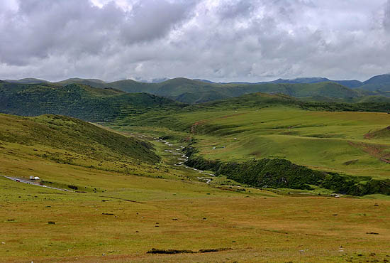 Utunk Tchetótól Lhagongig az eső ellenére kellemes volt, akárcsak egy szünidei sátortáborozás. A völgyek, amelyeken átutaztunk, szélesek voltak és termékenyek, itt-ott virágzó falvakkal vagy magányos tanyaházakkal. Olykor dzongok, a jellegzetes, széles és impozáns tibeti várkastélyok tekintettek le rájuk, amelyek szilárdan ültek a dombok vállán, s gyakran karcsú, félig romos őrtornyok szegélyezték őket. Ezek az őrtornyok, egy korábbi időszak, sőt talán egy ősi civilizáció emlékei csillag alaprajzon épülnek, úgyhogy szerkezetük bonyolultságával meglepik az utazót. A falvak között alacsony fallal körülvett, szépen művelt árpamezők, s itt-ott nyírfák és fűzfák csoportjai. Számos jakcsordával, nyájjal és ménessel találkozunk, amelyek szabadon legelnek a lejtőkön. Igazán boldog és nyájas táj, amelyet a nyár még éppen csak elkezdett feldíszíteni. A boglárkák már virágoztak a legelőkön, s ibolyák és nefelejcsek adták meg az utolsó képeslap-simításokat ennek az amúgy monoton tájnak.