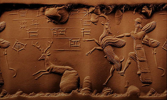 „Küzdelemjelenet: szárnyas hérosz és emberarcú szárnyas ibex, előttük szökellő szarvas”, Mardukhoz szóló akkád nyelvű imával. Újbabiloni kor (Kr.e. 600-500), Louvre