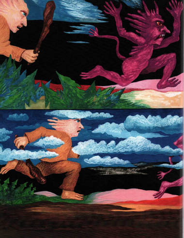 Úgyhogy szaladtak körbe-körbe, elöl Vanapagan fényes kiáltással, mögötte Tõll sötét ordítással. Az emberek a sövények mögé rejtőztek, nehogy valamiképpen közéjük keveredjenek, amíg ezek a számlájukat intézik. Persze mindenki Tõllnek drukkolt szívében, és biztosak voltak benne, hogy Vanapagan ezúttal nem ússza meg szárazon.